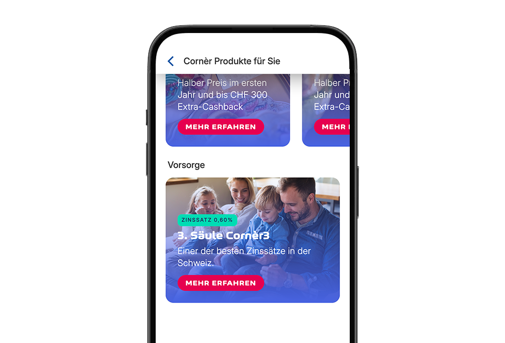Laden Sie die iCornèr App kostenlos herunter, um Ihr Cornèr3 Vorsorgekonto ganz einfach zu eröffnen und verwalten können.